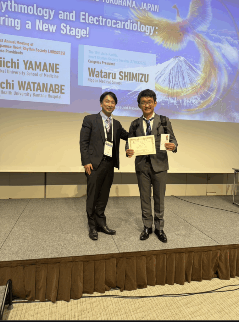 当科の七田先生が、三会合同研究会 (西日本心臓電気生理研究会/阪神アブレーション研究会/京滋奈良ハートリズム研究会)で心房細動に関する研究発表を行い、最優秀賞を受賞されました。 LATESTNEWS つぶやき よかったらシェアしてね! URLをコピーしました! URLをコピーしました! 第17回 研修医教育セミナーのお知らせ:第139回日本循環器学会 九州地方会 併催イベント 論文解説: CHIPが冠動脈の長期予後に与える影響は? この記事を書いた人 佐賀大学循環器内科 関連記事 【医師国家試験直前 JHRS公式 国試対策】をライブ視聴しました。 2026年1月15日 学生・初期研修医向けのエコー勉強会(ハンズオン)を開催いたしました 2026年1月14日 Heart Rhythm Society (HSR) podcastのお知らせ 2026年1月10日 受賞のお知らせ:佐賀大学医学部長賞(研究)・医学部長賞(学生教育) 2026年1月10日 論文解説: CAVBにおけるLBBAP意義は?MELOS RELOADED study 2026年1月6日 受賞のお知らせ:臨床薬理研究振興財団賞学術奨励賞 2025年12月25日 論文アクセプトのお知らせ: EHJ case report 2025年12月24日 受賞のお知らせ:第139回日本循環器学会九州地方会メディカルセッション優秀賞・メンター賞の受賞 2025年12月23日